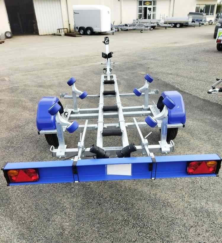 Cette remorque porte-bateau à timon basculant peut transporter sur route et mettre à l’eau sans effort un bateau d’une longueur maximale de 4,6 m et d’un poids maxi de 560 Kg.