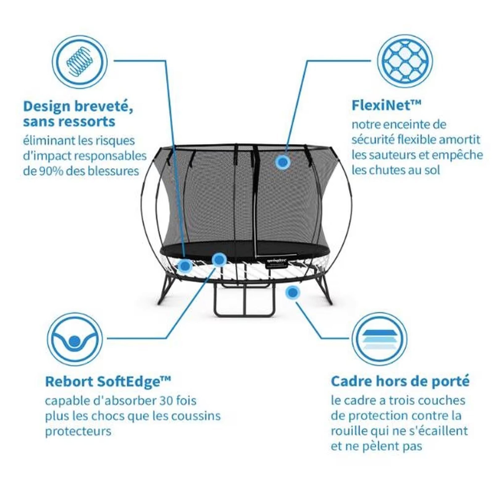 Notre design breveté de trampoline sans ressorts a changé la façon dont les trampolines fonctionnent et a aussi éliminé les risques d’impacts responsables de 90 % des blessures liées à l’utilisation.